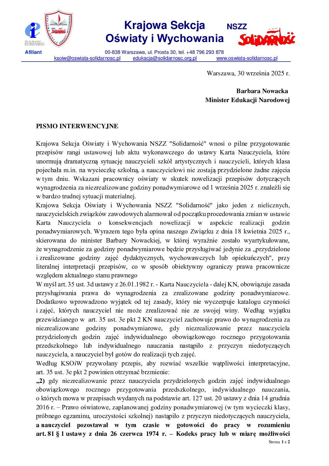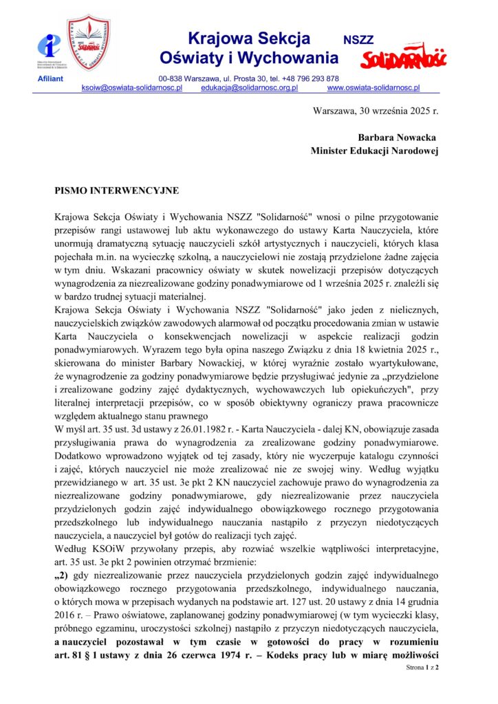Pismo interwencyjne KSOiW NSZZ Solidarność 2 października 20252 października 2025 admin Komisja Międzyzakładowa
